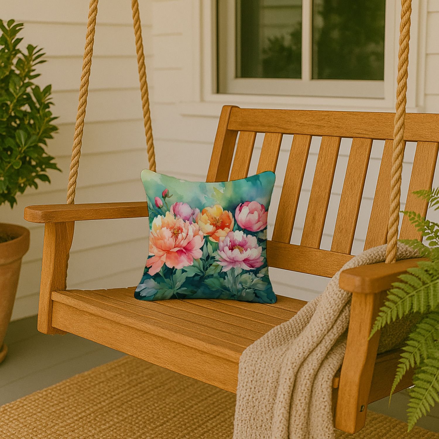Indiana Peonies in Watercolor Throw Pillow Machine Washable, Indoor Outdoor Decorative Pillow for Couch, Bed or Patio, 14Hx14W