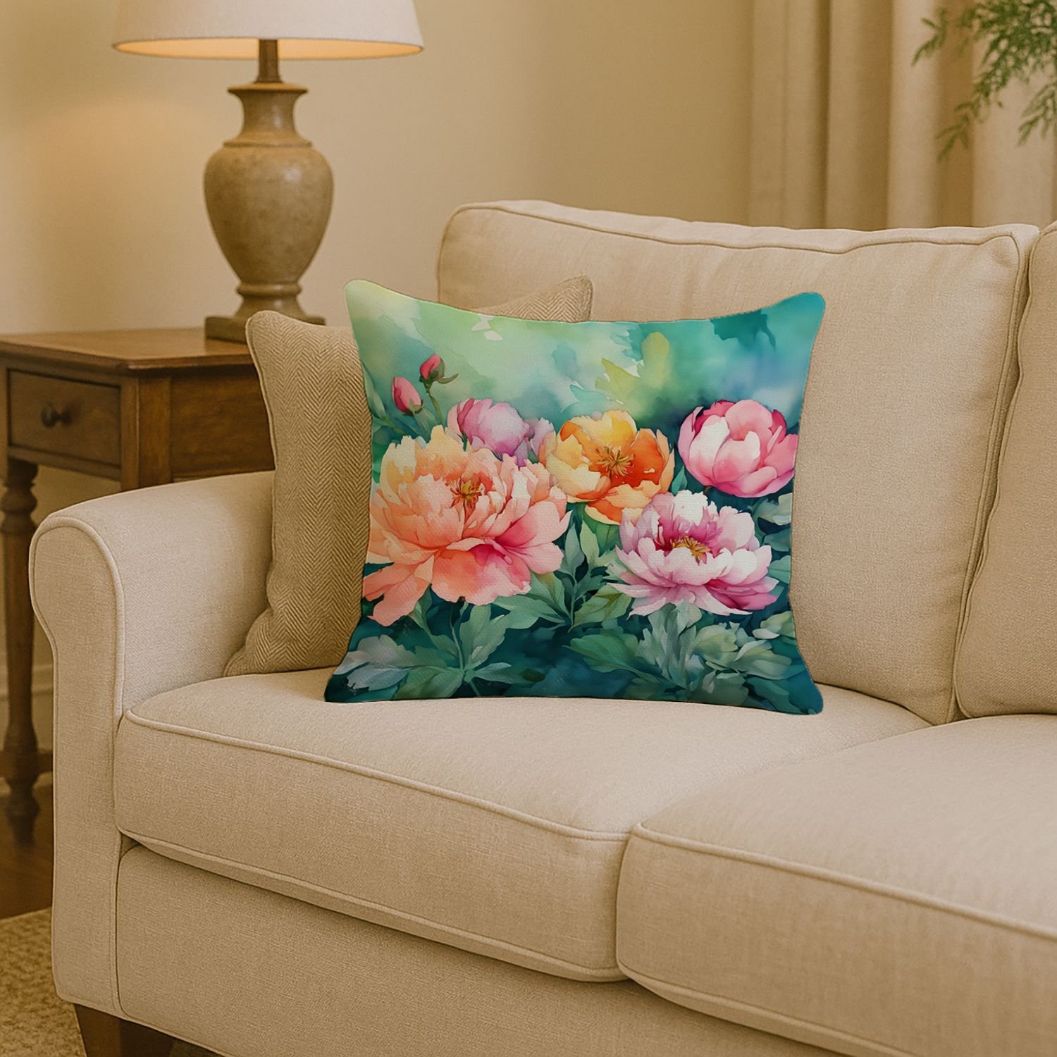 Home > Indiana Peonies in Watercolor Throw Pillow Machine Washable, Indoor Outdoor Decorative Pillow for Couch, Bed or Patio, 14Hx14W