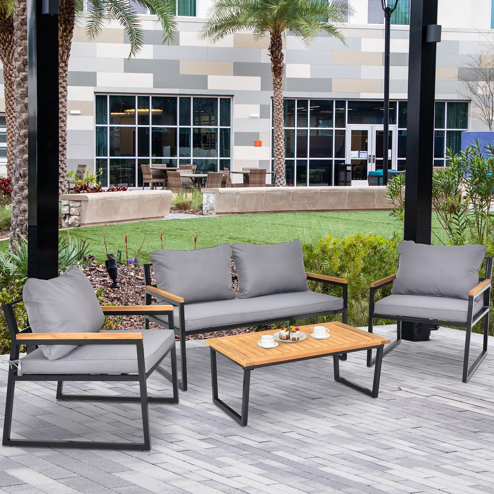 Elevate your outdoor lounging experience with our 4 Piece Outdoor Patio Lounge Conversation Set. This set combines the modern durability of a metal frame with the natural elegance of acacia wood, creating a stylish and comfortable outdoor living space. Perfect for backyard gatherings, balcony relaxation, or deck enjoyment, this set includes spacious seating with soft, thick cushions for ultimate comfort and a solid wood tabletop for convenience and style. The water-repellent cushion covers and easy-to-clean tabletop ensure maintenance is a breeze, making this set a practical choice for any outdoor setting.