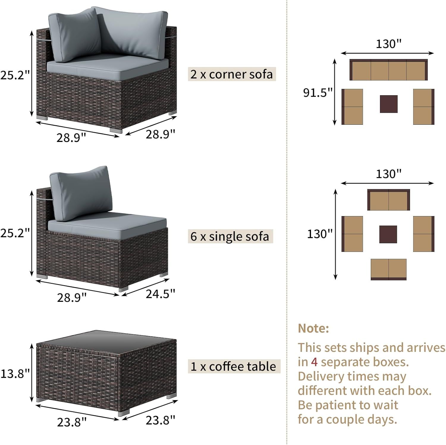 The cushion of the outdoor sectional sofa is filled with soft PP cotton and has a height of 9cm. Comfortable cushion is securely fastened to the rattan sofa with a binding rope to prevent it from being blown away by external force.Two pillows are also equipped in the patio sectional sofa set for added comfort.