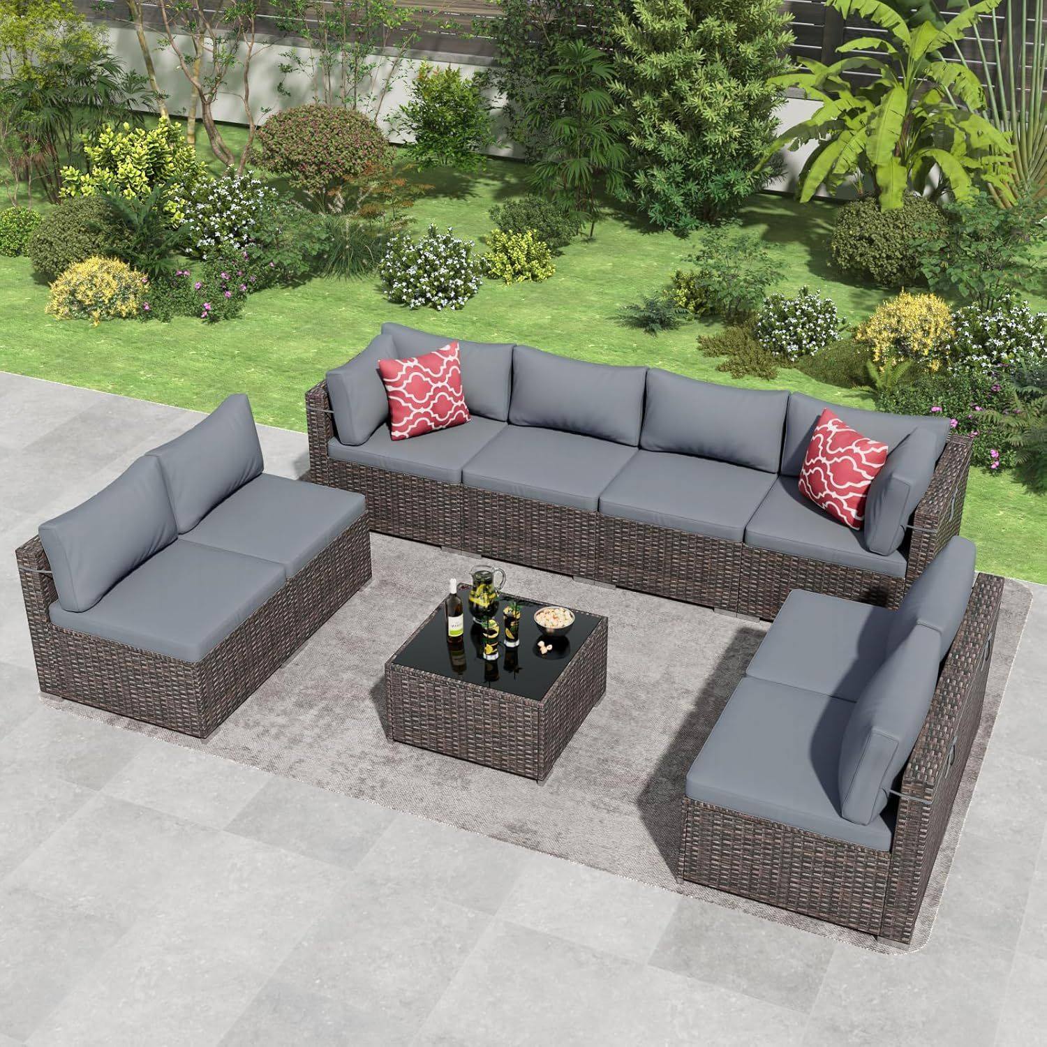 9 Pieces Outdoor Patio Furniture Set, Wicker Patio Conversation Sectional Sofa Set, All Weather PE Rattan Sofa with Glass Table and Cushions 9 Pieces Outdoor Patio Furniture Set, Wicker Patio Conversation Sectional Sofa Set, All Weather PE Rattan Sofa with Glass Table and Cushions 9 Pieces Outdoor Patio Furniture Set, Wicker Patio Conversation Sectional Sofa Set, All Weather PE Rattan Sofa with Glass Table and Cushions