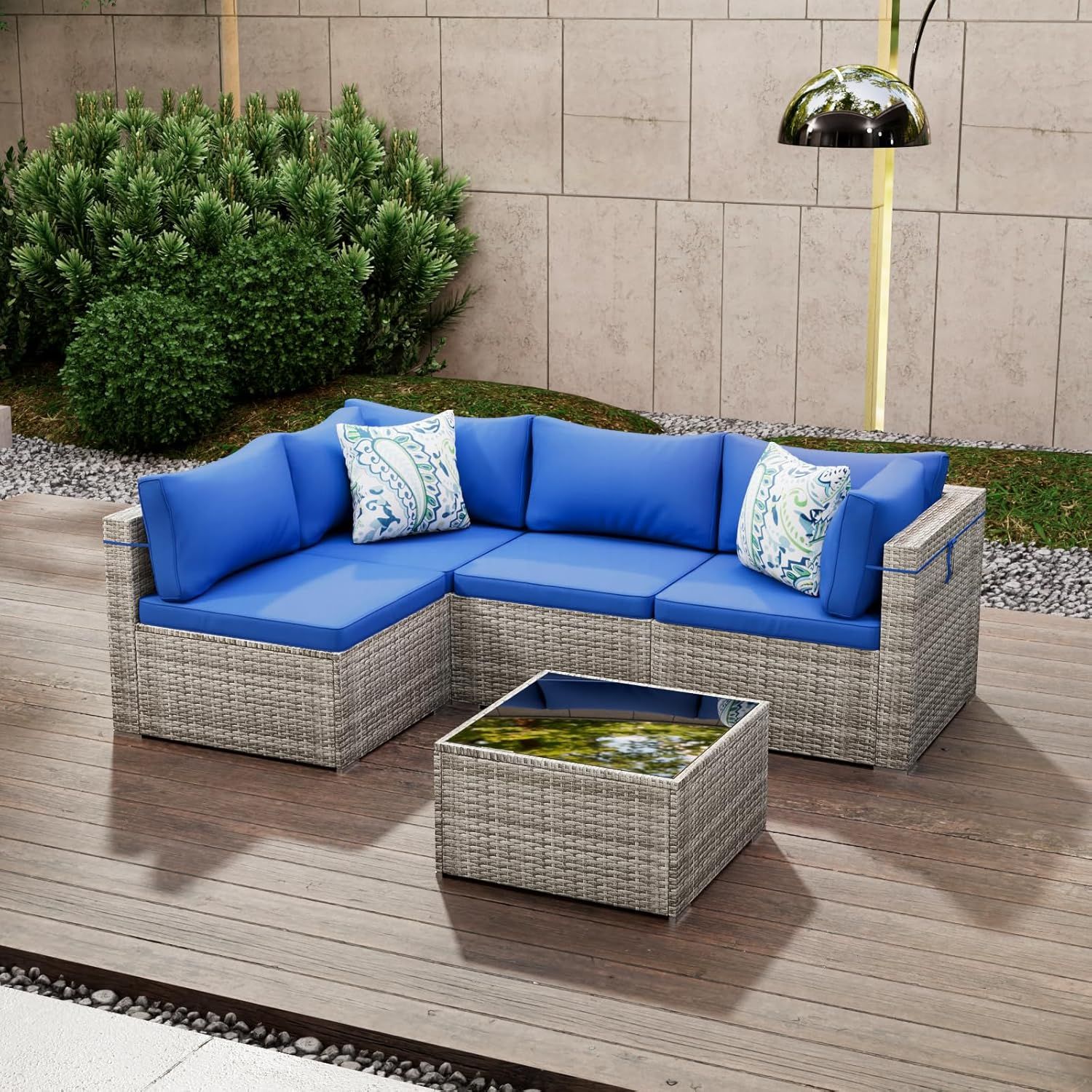 Home > 5 Pieces Outdoor Patio Furniture Set, Wicker Patio Conversation Sectional Sofa Set, All Weather PE Rattan Sofa with Glass Table and Cushions