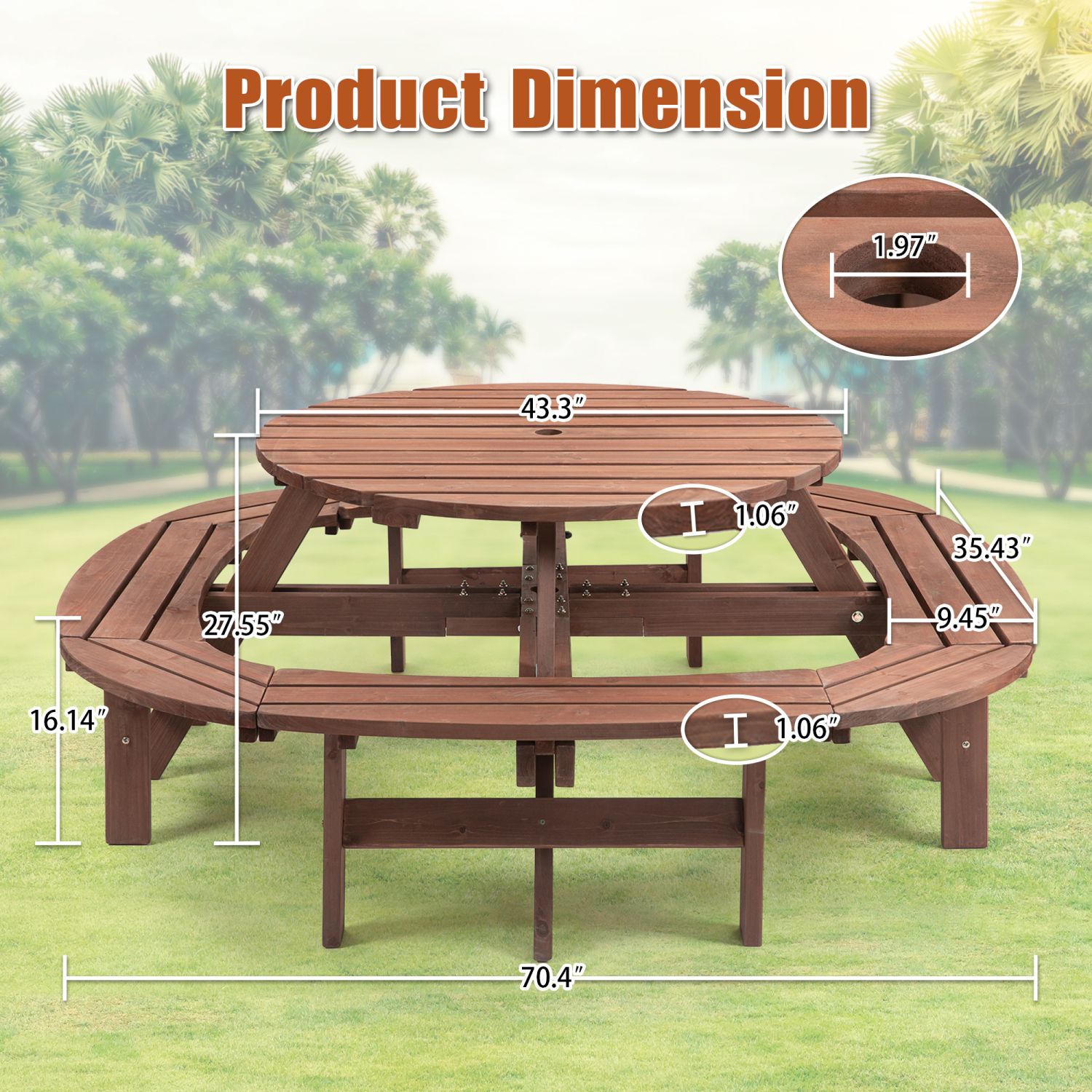 10-12-person Round Outdoor Wooden Picnic Table for Patio, Backyard, Garden, DIY with 1 Built-in Ring Stool, 500-lb Weight Capacity - Walnut Brown 10-12-person Round Outdoor Wooden Picnic Table for Patio, Backyard, Garden, DIY with 1 Built-in Ring Stool, 500-lb Weight Capacity - Walnut Brown 10-12-person Round Outdoor Wooden Picnic Table for Patio, Backyard, Garden, DIY with 1 Built-in Ring Stool, 500-lb Weight Capacity - Walnut Brown