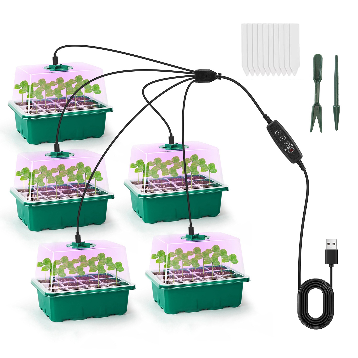 5Packs Seed Starter Tray With Grow Light Humidity Dome Germination Kit with 5-Level Brightness 4 Timers for Indoor Greenhouse