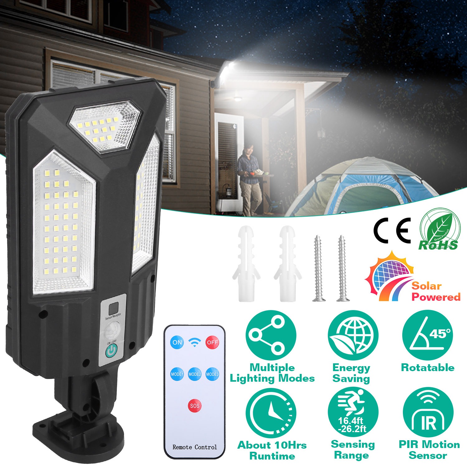 5 Remote Control Modes: ON Mode: High Brightness When Motion Detects(20S); Light Turns Off After People Leaves; MODE 1: High Brightness When Motion Detects(20S); Dim Light When People Leaves; MODE 2: Constant Dim Light; MODE 3: Quick Flash; SOS: Slow Strobe