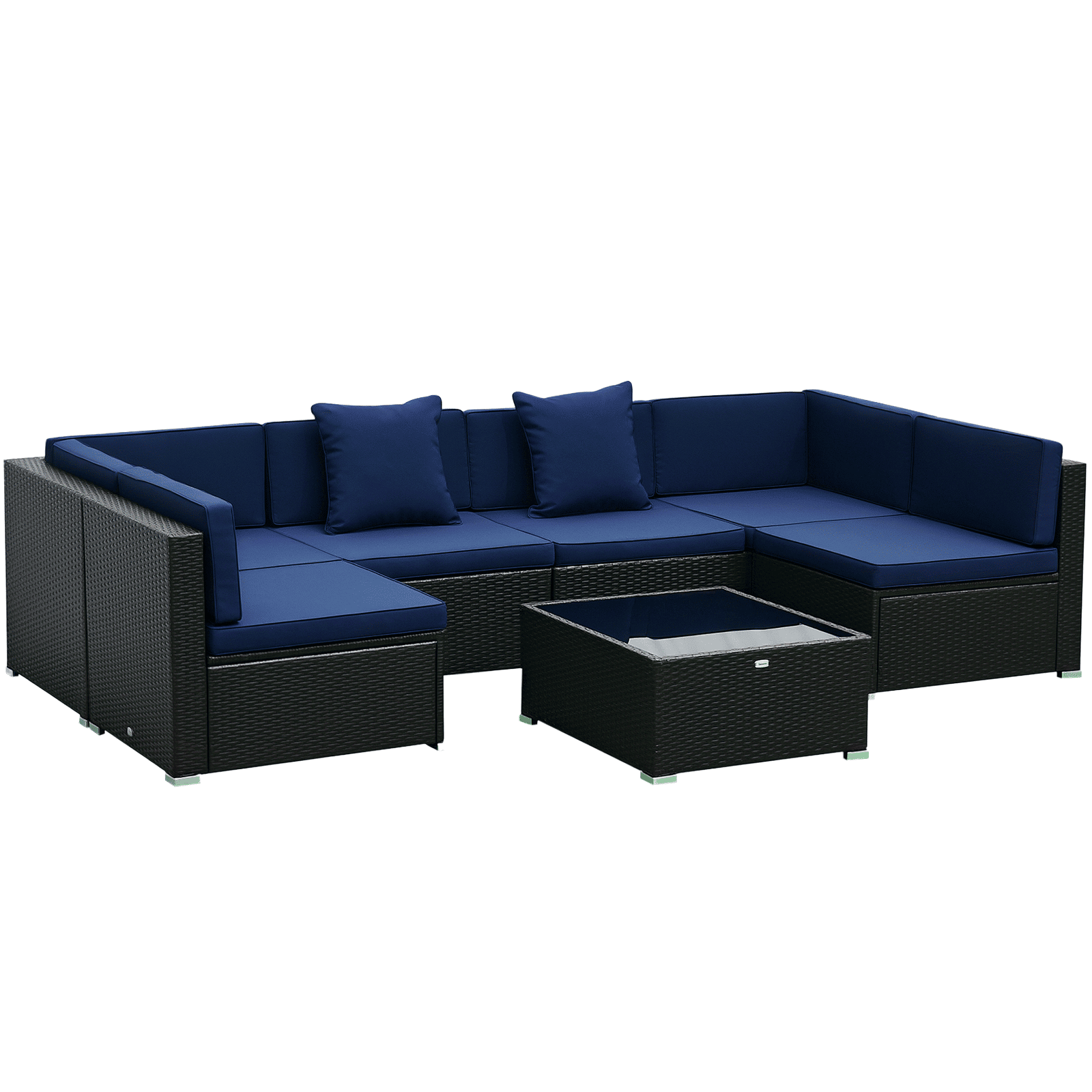 This seven-piece rattan sectional set brings the comforts of your living room to your backyard. Everything is there: two corner sofa sections, four stand-alone couch sections, and a coffee table. Enjoy the perks of home, like throw pillows and thickly padded cushions in the great outdoors. Easy to rearrange and capable of customizing to your occasion, it offers a versatile seating solution for six. Get out, get comfortable, get Outsunny.
