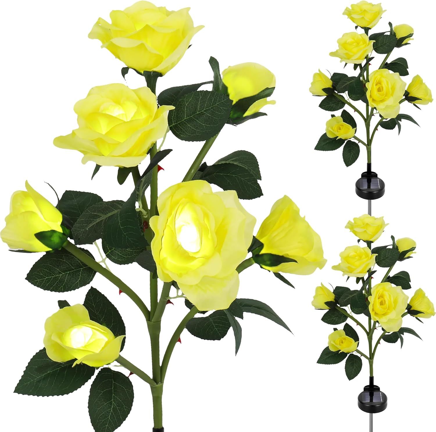 Enchanting Solar Rose Stake Lights: 2 pack realistic solar flower lights with 14 artificial roses, Transform your outdoor space with our realistic solar rose lights, featuring lifelike petals that glow in dazzling colors. Perfect for adding a touch of elegance to gardens, pathways, or patios—day or night!Effortless Solar-Powered Operation: No wiring, no electricity costs! Equipped with a high-efficiency 600mAh solar panel, these lights charge by sunlight and auto-illuminate at dusk, providing eco-friendly, hassle-free lighting all year round.Mesmerizing 7-Color Changing Display: Create a magical atmosphere as the roses cycle through 7 vibrant hues—ideal for holidays, parties, or everyday charm. Watch your garden come alive with a captivating light show!All-Weather Durability (IP65 Waterproof): Built to last with IP65 waterproof & weatherproof materials, these stakes endure rain, snow, and extreme temperatures. Enjoy vibrant, reliable lighting in every season!Unforgettable Gift for Garden Lovers: A unique & heartfelt present for Mother’s Day, birthdays, or anniversaries. These solar roses combine beauty + sustainability, making them a gift that keeps on glowing!